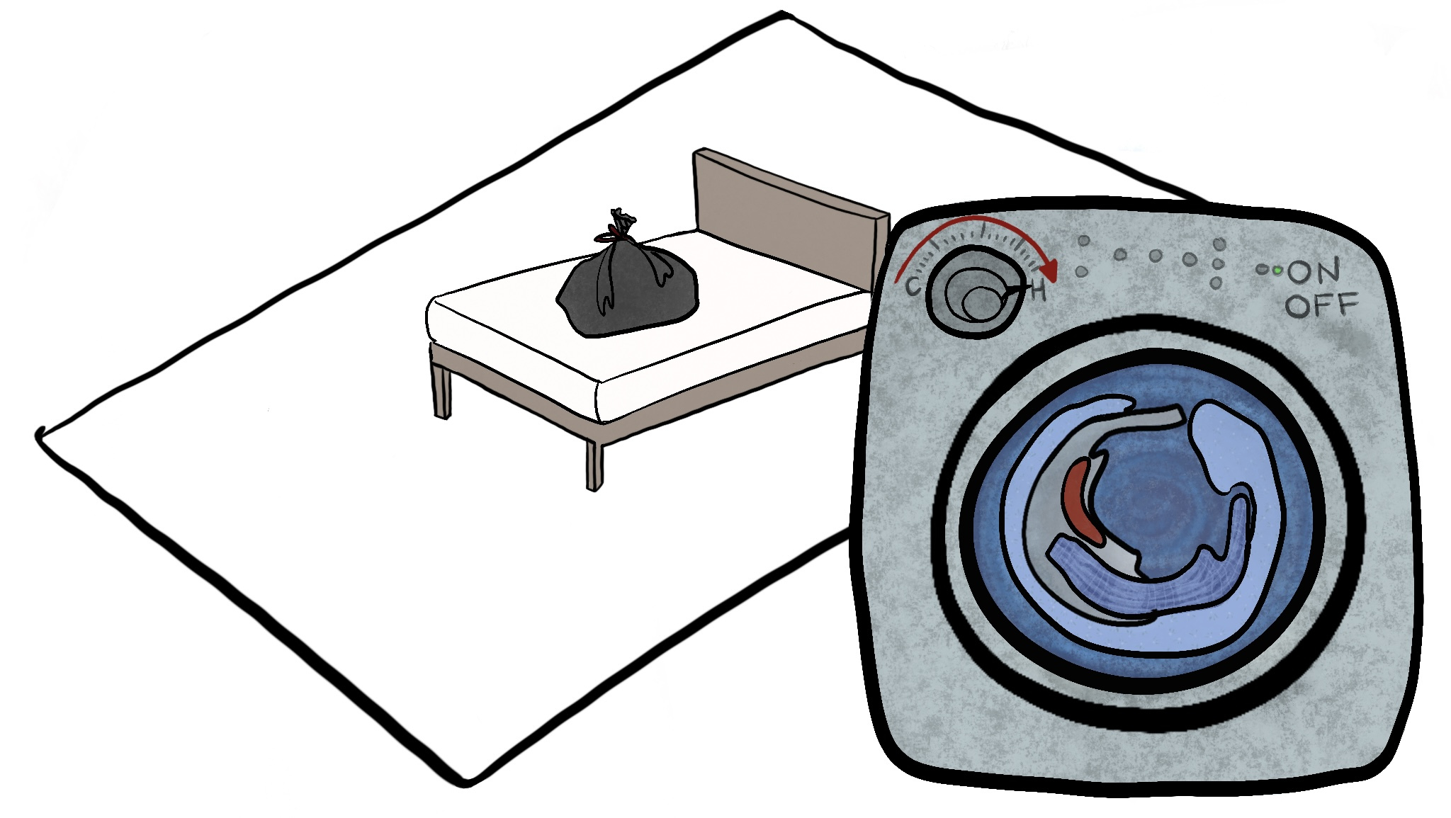 Gather your sheets and bed coverings inside a trash bag, securely closing before relocating to washer. Wash and dry (if dry clean only, dry heat is suffice) on high heat to kill all present bed bugs.